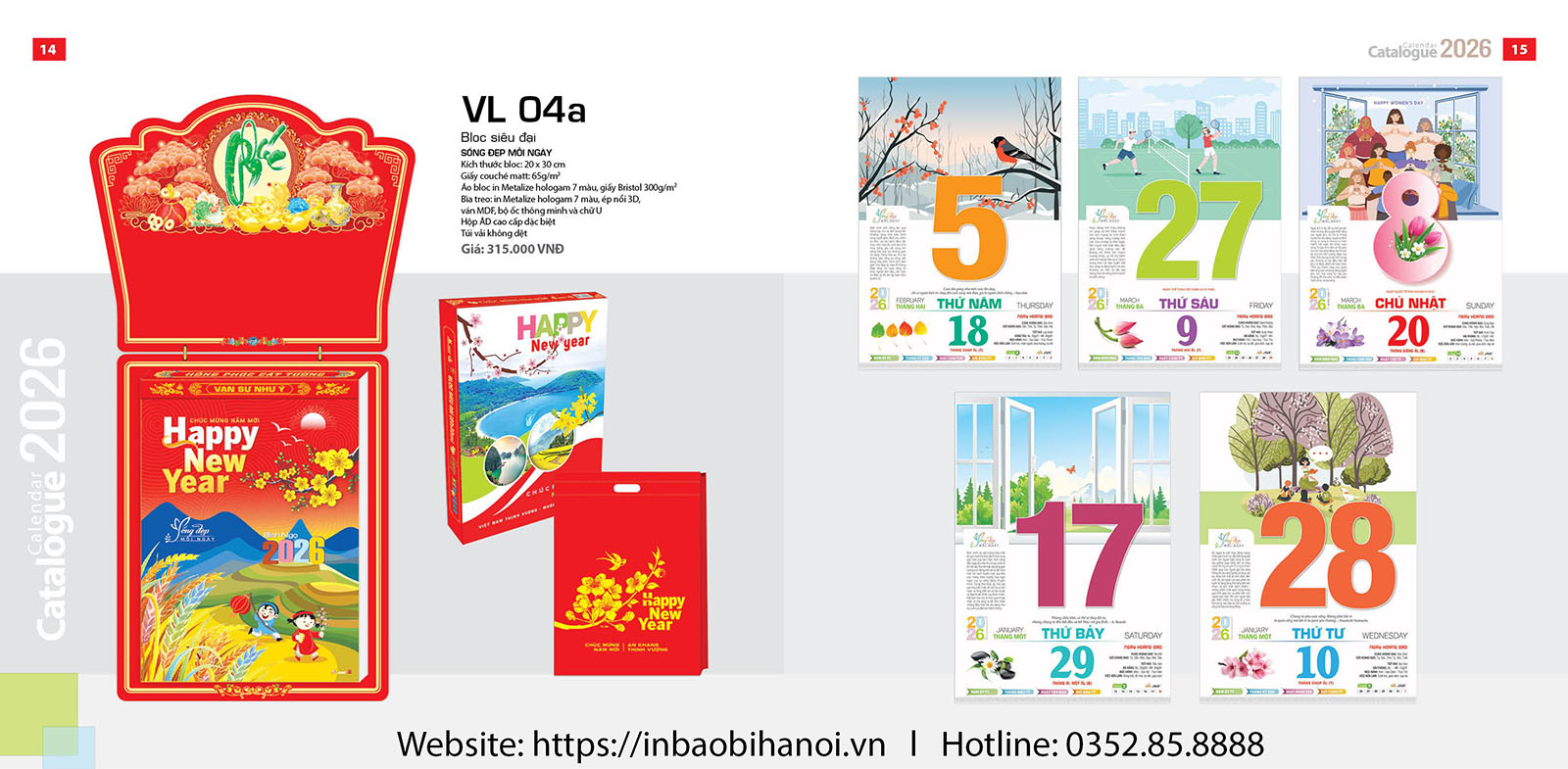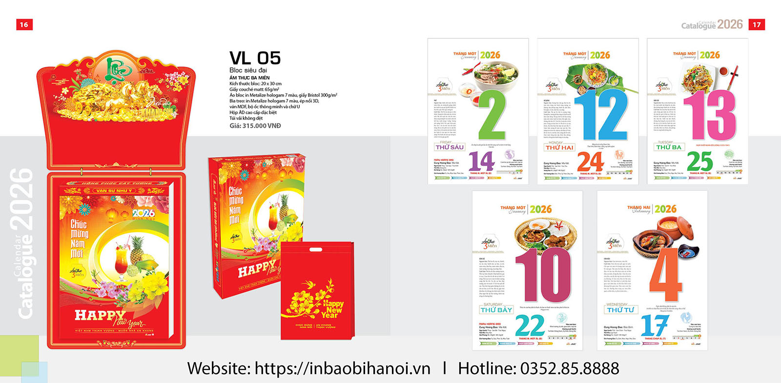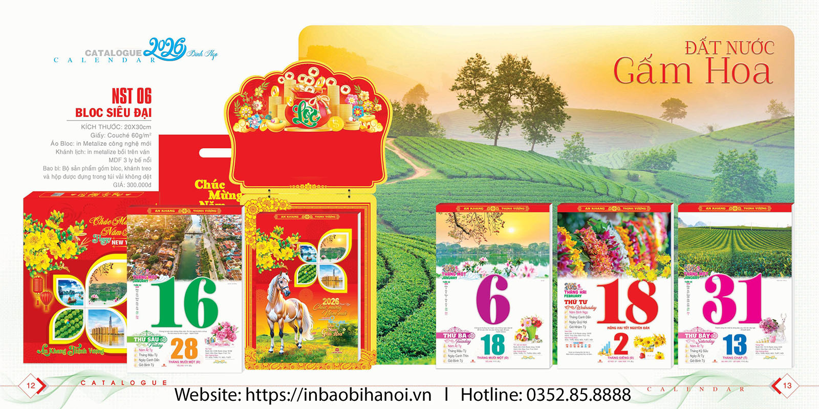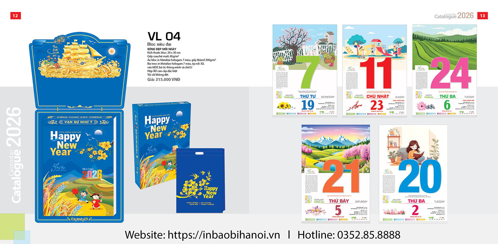 Bộ Lịch Bloc Siêu Đại 2025 gồm: – Khánh Lịch: In theo công nghệ mới metalize. Ép nổi 3D. – Kích thước bloc lịch 365 tờ: 20x30 cm – Hộp đựng lịch. – Túi đựng lịch kèm theo. Mẫu Lịch Bloc Siêu Đại 2025 tại In Bao Bì Hà Nội :